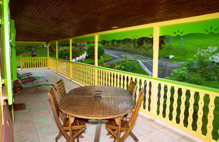 À l’origine dominé par des teintes naturelles et boisées, le décor a évolué vers un style colonial affirmé. J’ai choisi d’apporter de la vie au mobilier grâce à des couleurs caribéennes vives, le tout accompagné d’un jardin généreusement fleuri offrant gaieté, réconfort et de vastes espaces de détente.